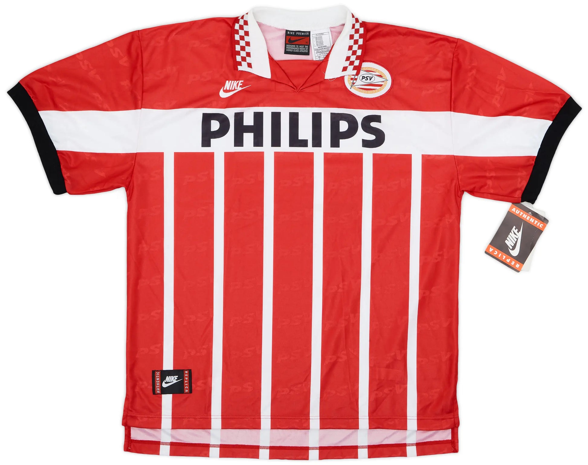 The jersey features PSV’s signature red and white vertical stripes, a thick black collar and sleeve cuffs, and the classic Philips sponsor across the chest. The club’s crest and Nike Swoosh are embroidered on the front, while Ronaldo’s name and number are printed on the back in 1990s-era Eredivisie block lettering.