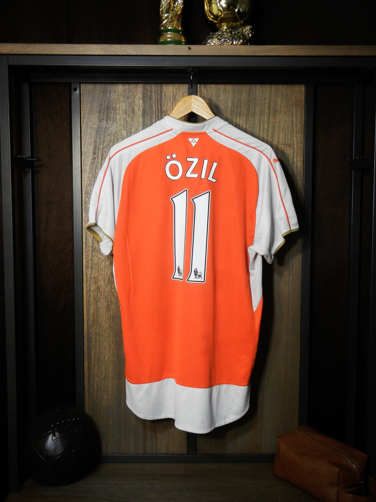 Produced by Puma under MPN: 747566, the shirt showcases Arsenal’s traditional color palette with gold trim accents, breathable polyester fabric, and the Fly Emirates sponsor front and center. Özil’s name and number are printed in official Premier League font, capturing his creative legacy in midfield.