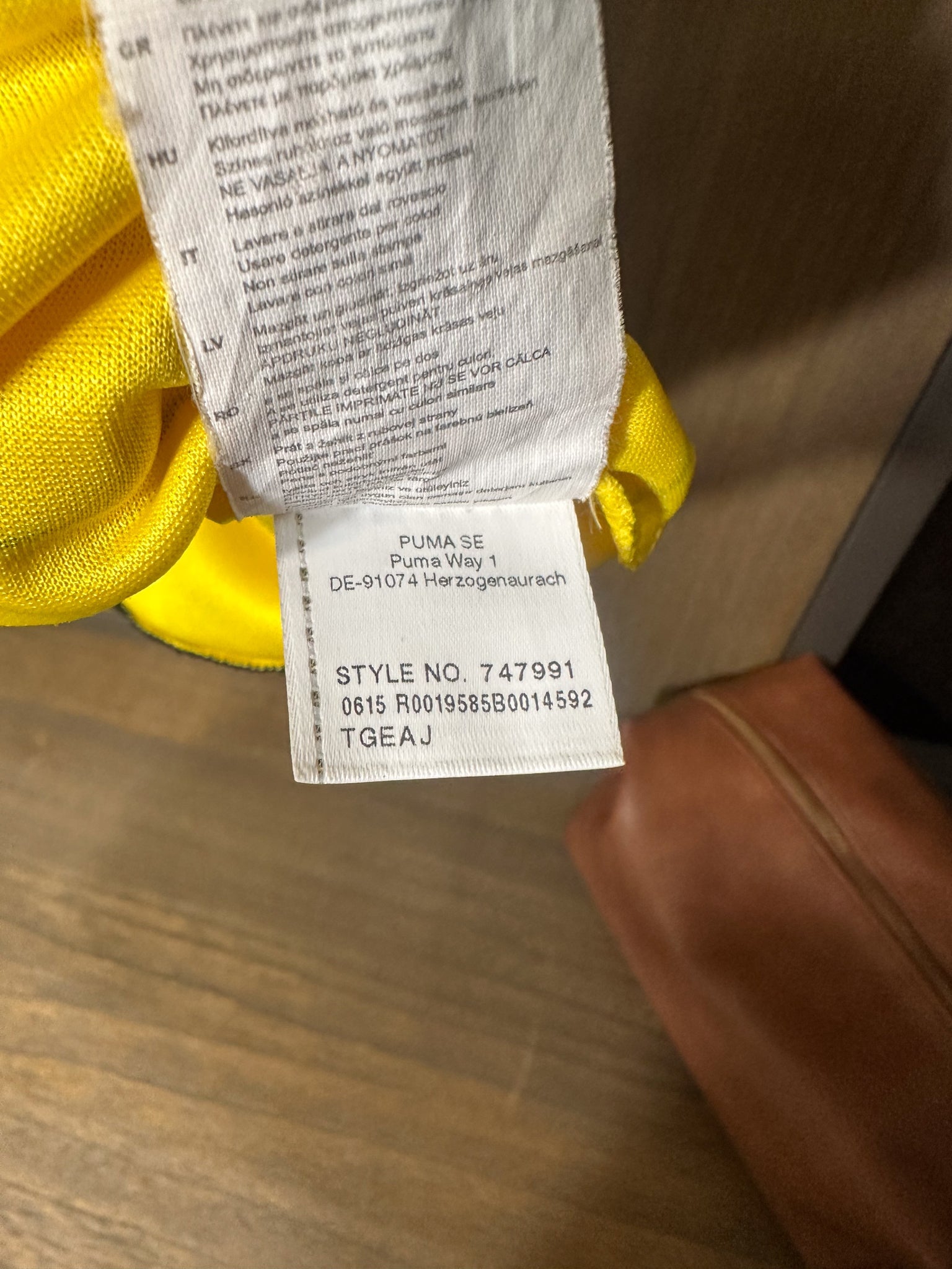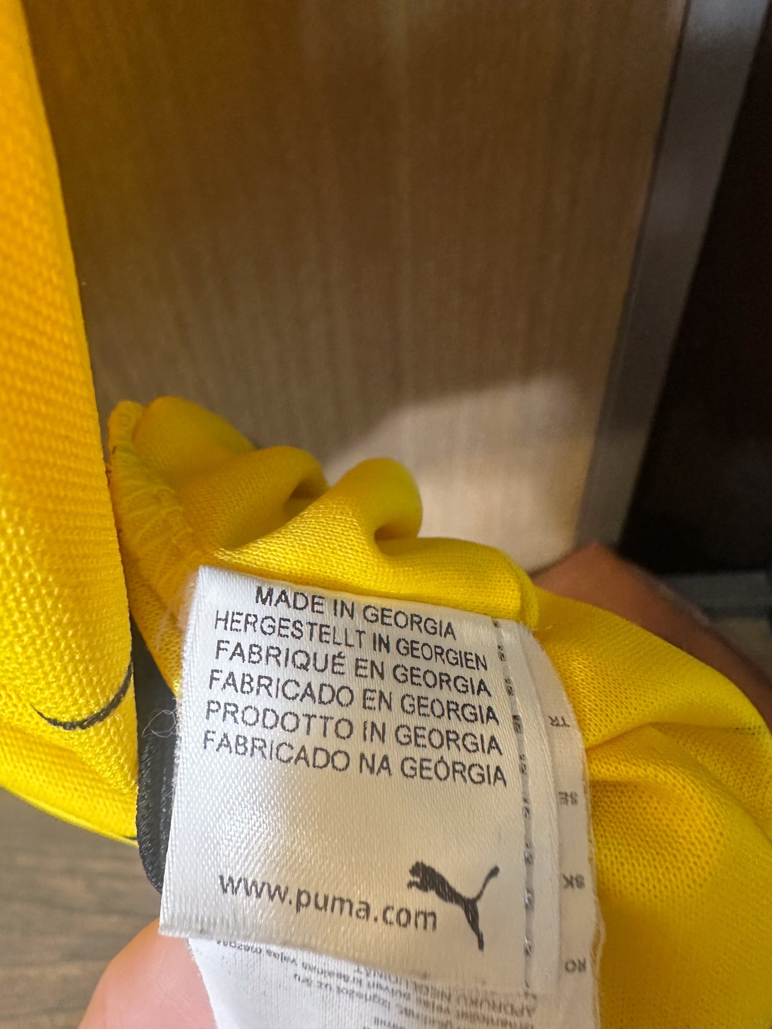 Produced by Puma under MPN: 747991, the shirt showcases Dortmund’s bold yellow with contrasting black pinstripes and accents, a modern collar design, and official club and sponsor logos. Aubameyang’s name and number are printed on the back in original league style, making this a prized item for collectors and die-hard fans.