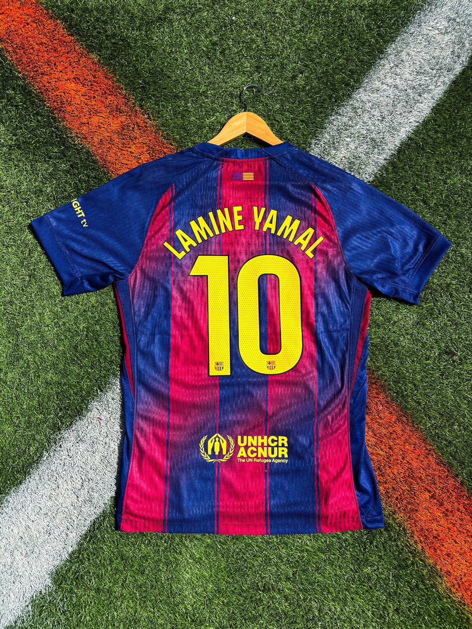This Nike-designed kit merges classic Blaugrana tradition with bold new visuals: yellow logos and sponsor accents, a Catalan Senyera flag above the back collar, and the team's name printed inside the neckline . Built for peak performance, it features lightweight, moisture-wicking fabric ideal for both matchdays and streetwear.