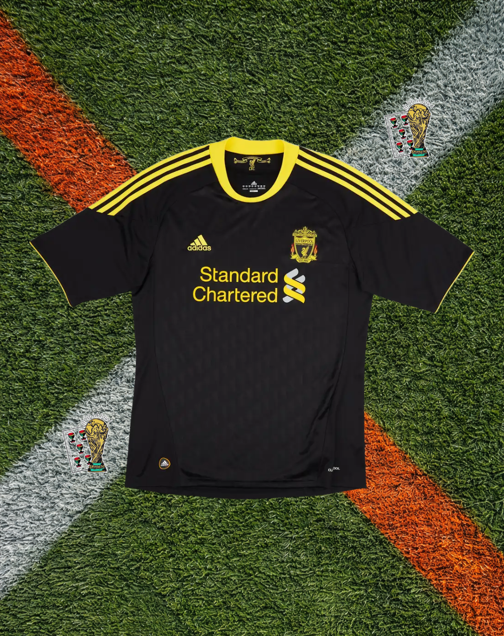 This bold third kit stands out with its stealth black base, electric yellow detailing, and three-stripe Adidas shoulders, making it one of the most unique Liverpool shirts of the early 2010s. Featuring the early years of the Standard Chartered sponsorship era, this design combines modern performance tech with unmistakable 2010s football nostalgia.