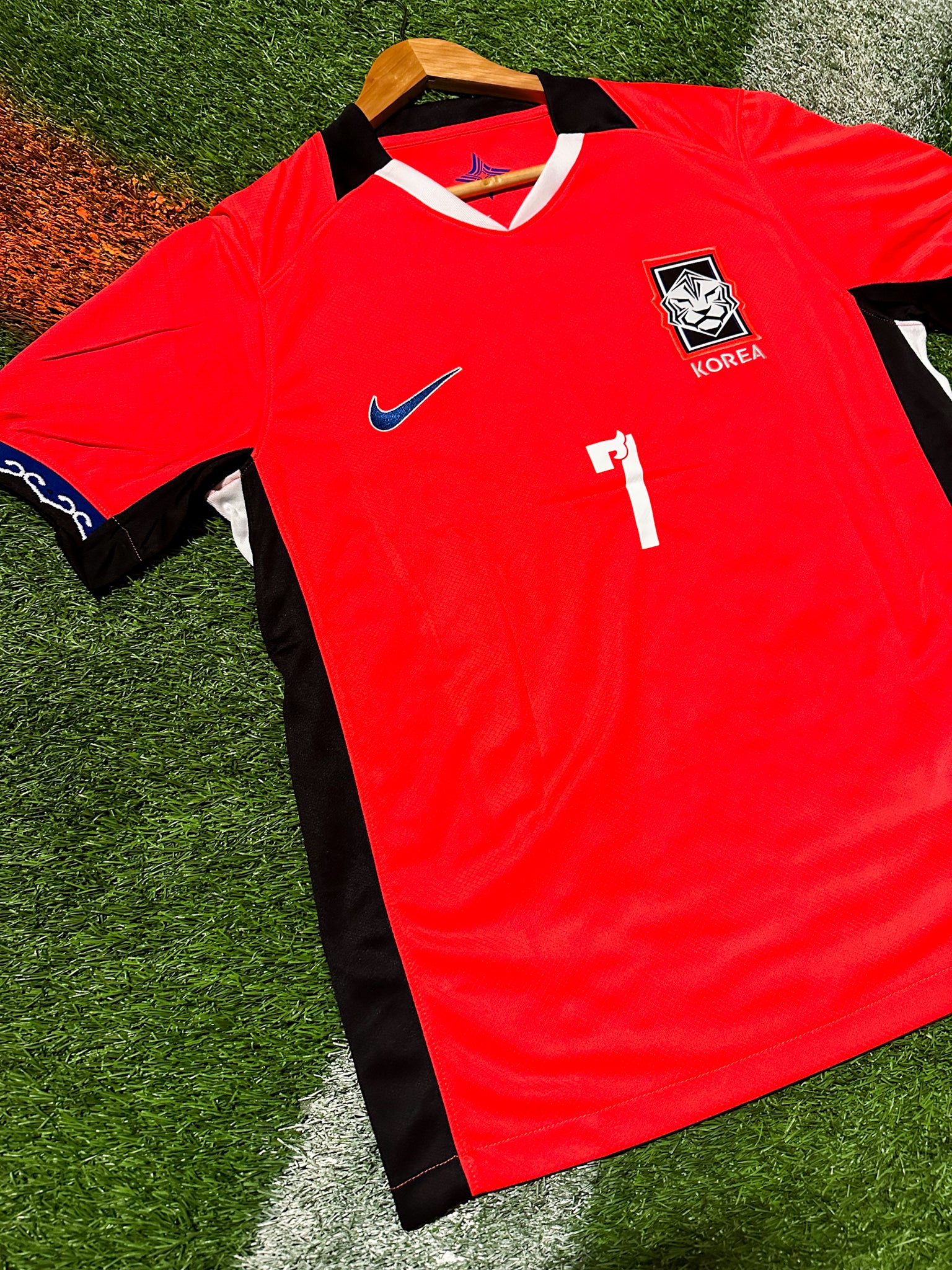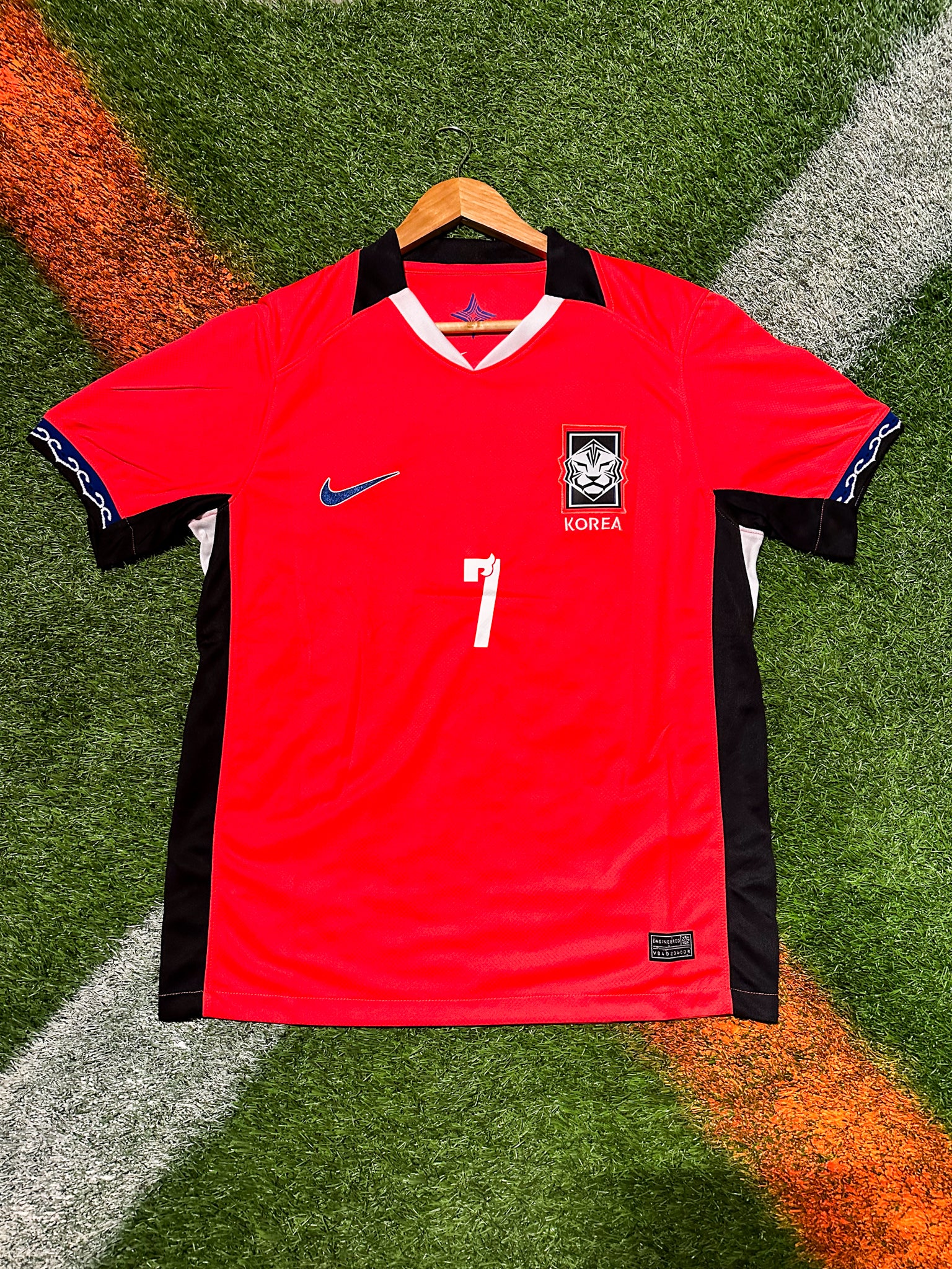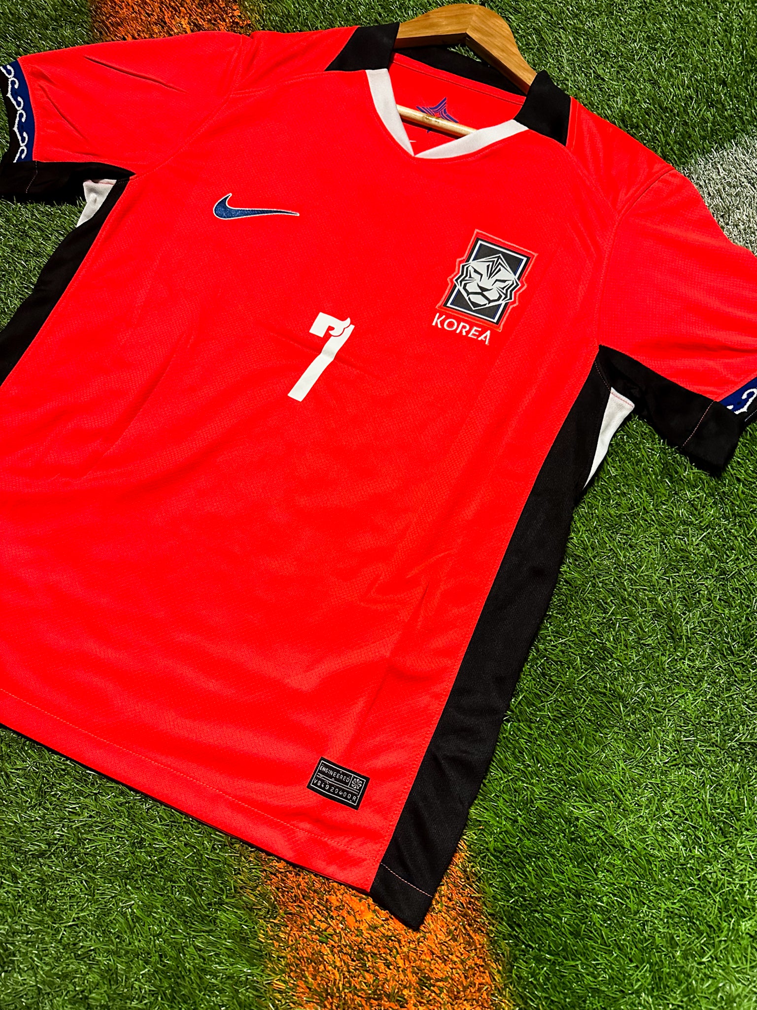 The vibrant red colorway represents national pride, while the sleek tiger-stripe detailing symbolizes strength and fearlessness. Son’s name and number are printed with premium, durable materials to ensure long-lasting quality. Perfect for fans, collectors, or anyone celebrating Korea’s pursuit of World Cup glory.