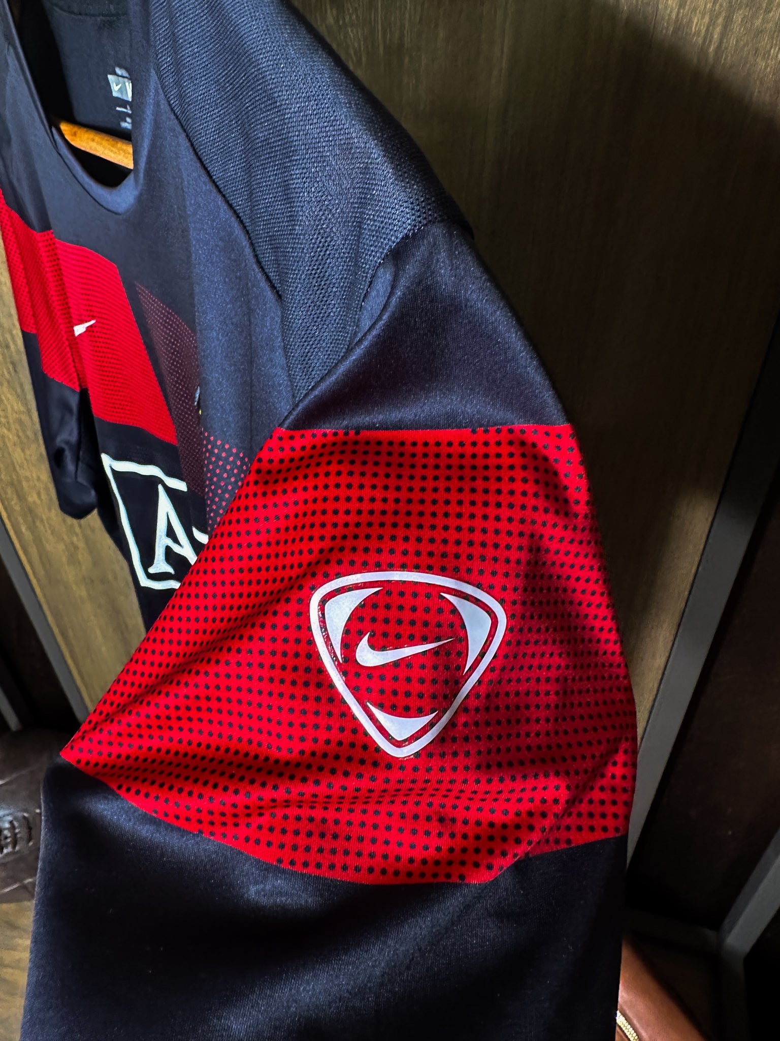 Crafted by Nike under model number MPN: 355105-010, this shirt showcases a bold all-black design with red trim, ventilated paneling, and the club crest proudly printed on the chest. Lightweight and breathable, it’s perfect for both training and casual wear.