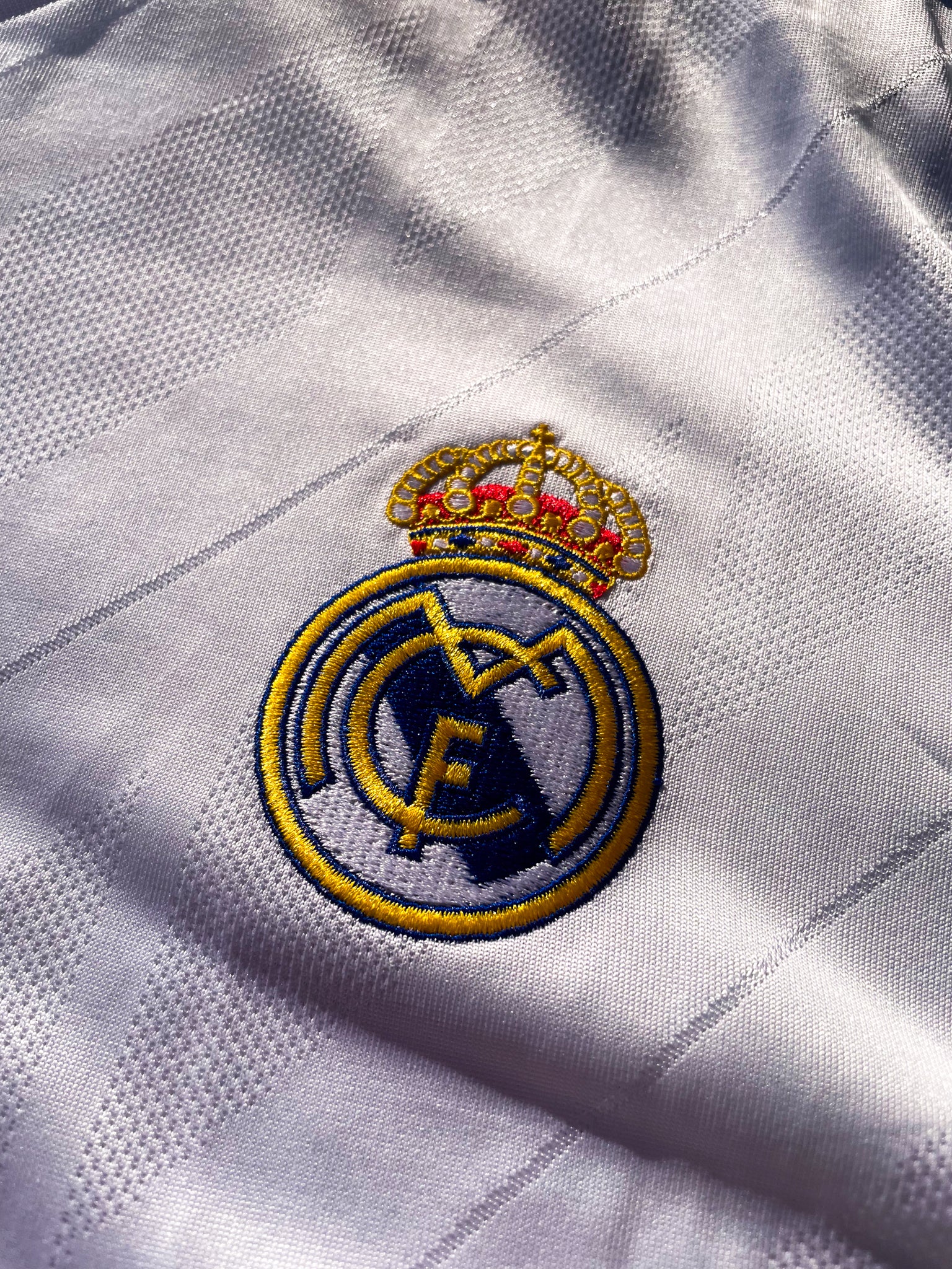 Fly Emirates sponsor logo and embroidered Real Madrid crest